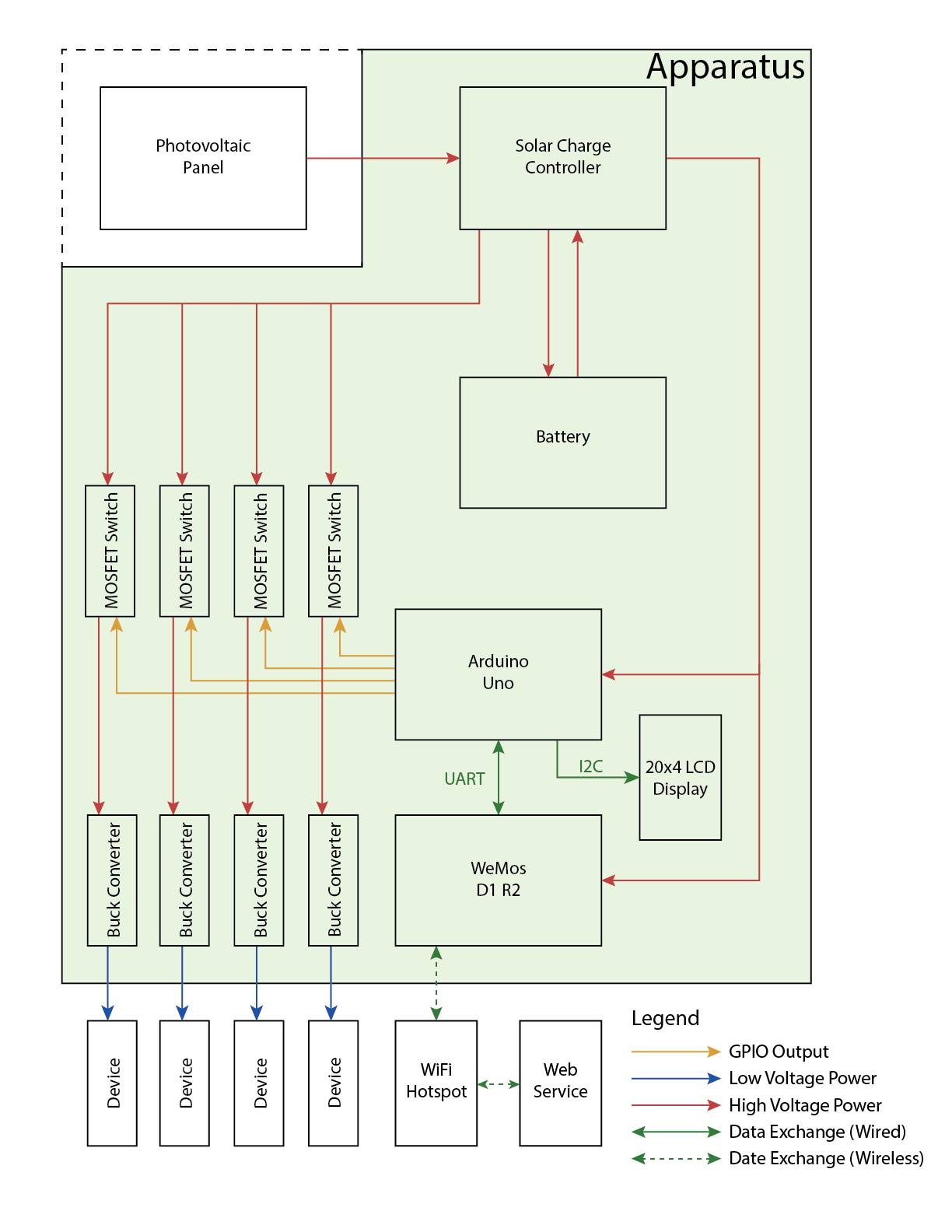 The charging station uses Arduino Uno and WeMos D1 R2 microcontrollers. For the photovoltaic systems, it uses a photovoltaic panel, a solar charge controller, and a battery. For voltage regulations, buck converters are used and MOSFETs serve as the switches to switch the buck converters on or off.