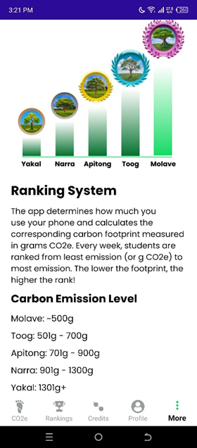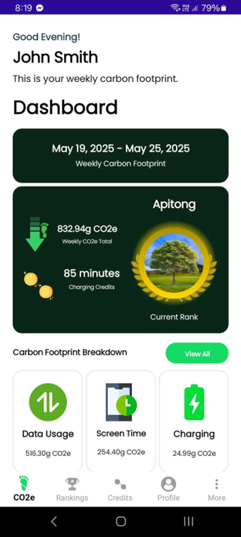 The web app collects every user’s mobile phone usage activity. It then aggregates the collected values and creates visuals of the carbon footprint. The five sources of carbon footprints are duration of calls, active screen time, and charging, number of SMS text messages, and the amount of cellular data usage.