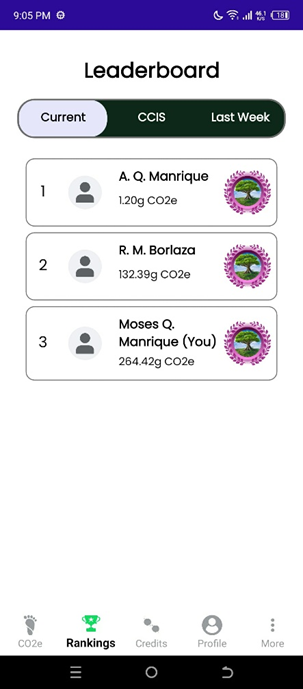 Users are ranked by their carbon footprint from lowest to highest. They are grouped in tiers based on their accumulated carbon footprint per week. The leaderboard is finalized every Mondays, and charging credit rewards are issued at the same time.