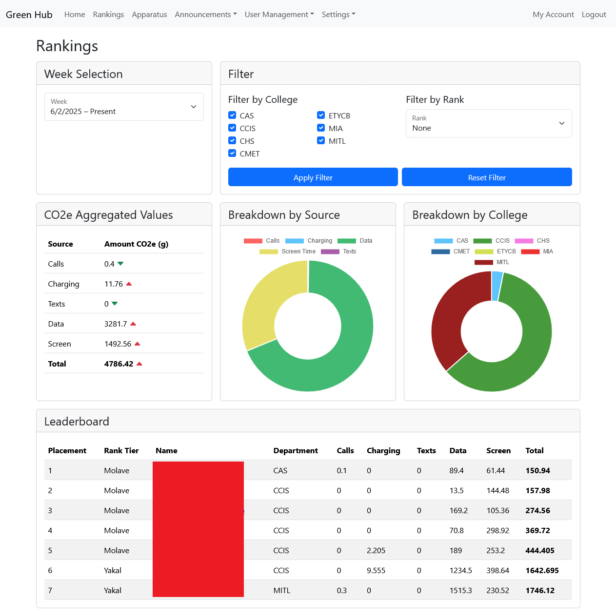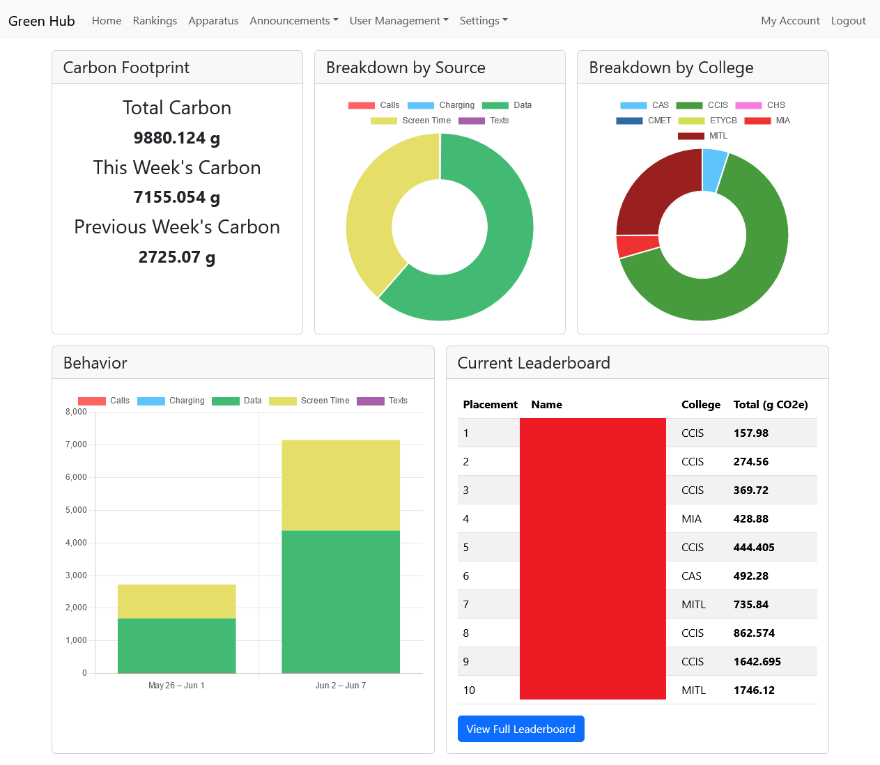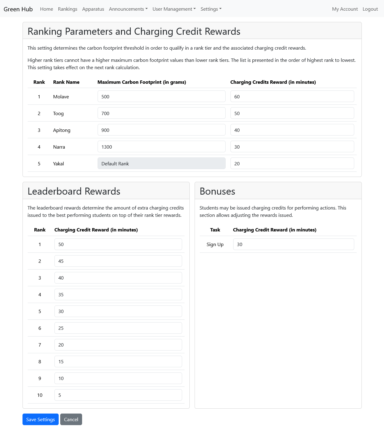 The web application allows an administrator to check the campus carbon footprint and manage the gamified system. Management tasks include changing the ranking parameters and charging credit rewards. Charging credits are the rewards issued to users and are used to active a port on the charging station. Other management tasks include updating Terms of Use and Privacy Policy documents, calculation parameters, and system settings and managing apparatuses.
